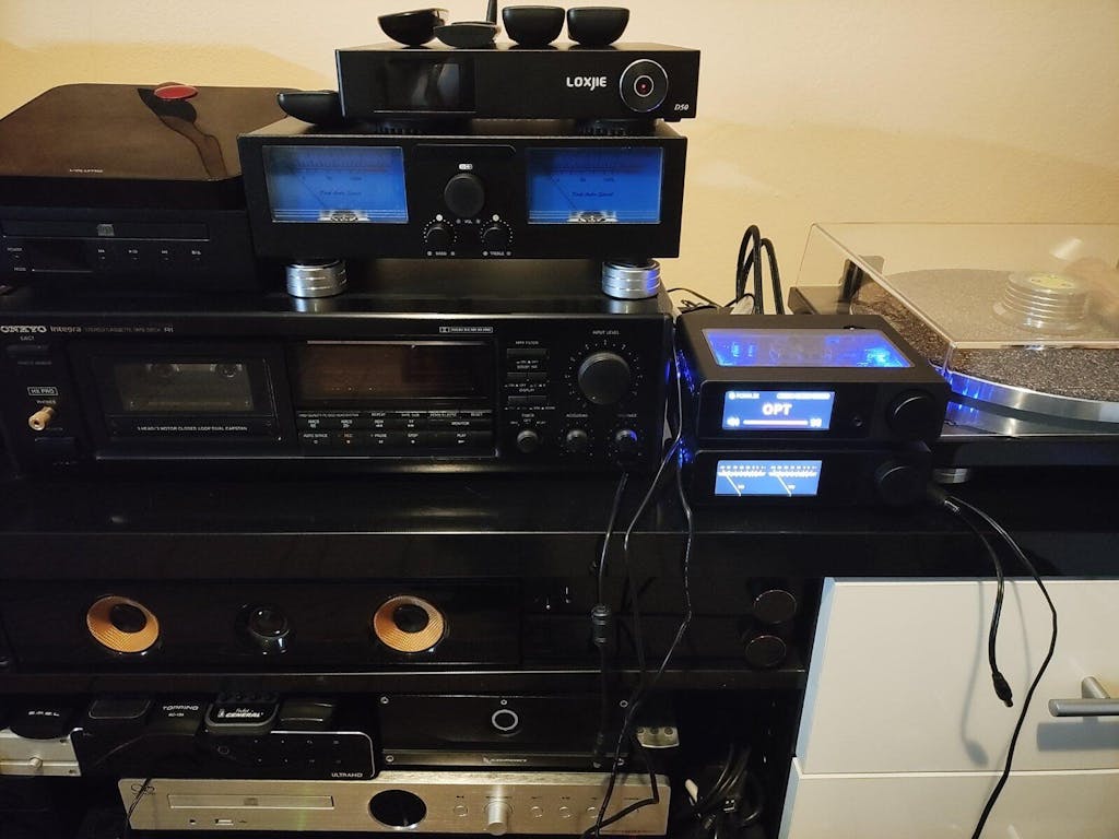 - Expressive Display with Style: The screen clearly shows input mode, DAC chip assignment, USB driver mode, and volume—everything you need at a glance. Q1 also offers 11 unique display modes, including diverse retro-style VU meters, audio spectrum, spinning vinyl, and cassette-style reels, each adding visual character to your HiFi setup.